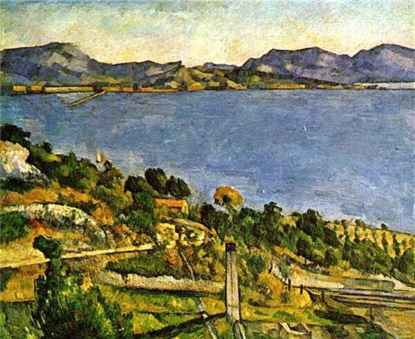 这幅画是清冷的,首先在表现空间的手法上,塞尚将自己实际所在处从画面中脱离出来,这也就意味着删除了画作中个人的主观情绪。我们无法将塞尚的所在处固定,因为若是从爱斯塔克眺望画面远处的群山,看到的其实只是模糊的轮廓。而塞尚为了展示群山的结构,在保持画面空间远近关系的前提下特意将它们拉近。海面也采取了同样的处理方法,塞尚用居高临下的方式来展示海洋,效果类似从飞机上俯视。画面中仿佛他把海面抬了起来,一片辽阔。可以说,用这种手法表现的画面,最大化地突出了景物的特点,并淡化了作者的主观情感。