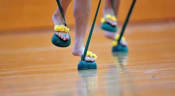 黎族椰壳舞流行于黎族聚居且盛产椰子的三亚、陵水一带,黎族椰壳舞的道具是椰壳和椰叶。舞者将若干个椰子壳对半锯开,并在每一半的椰壳的顶部与底部分别穿孔,并用鲜椰叶分别系牢顶和底的两头。舞者双脚趾分别挟着椰叶,脚踩底部的半边椰壳(状似踩高跷),双手则执着顶部的半边椰壳,然后按一致的节奏拍打,可以自由变换各种队列图形。