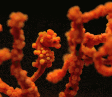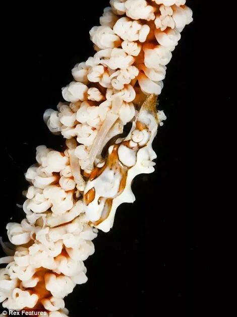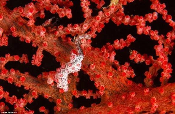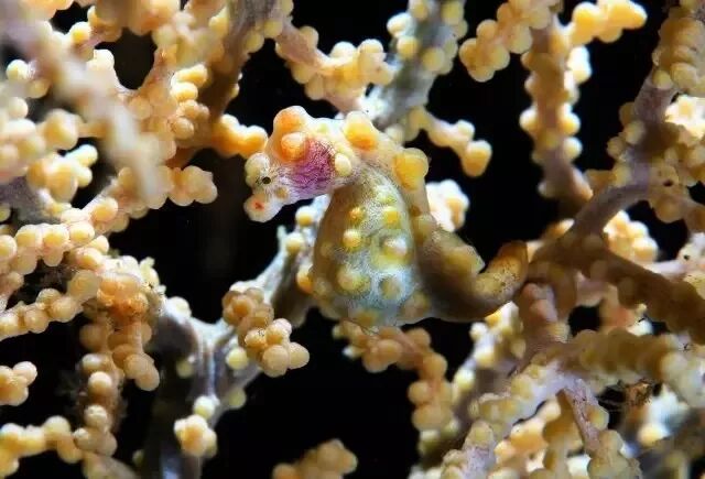 隐藏在珊瑚中的豆丁海马,身上长了拟态珊瑚的珊瑚虫,如果不是那对小眼睛出卖了它,藏在珊瑚中还是很难被发现的。